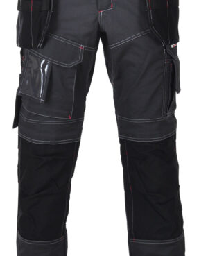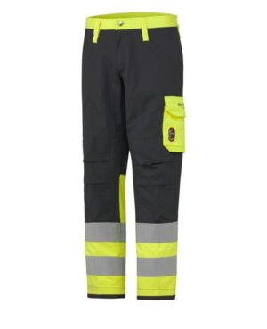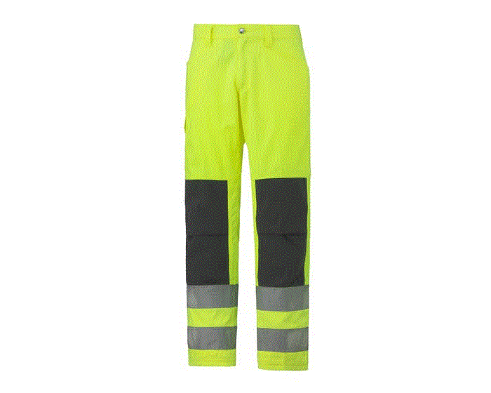 EN ISO 20471 klasse 2 Gylf med glidelås Plastdekte metallknapper To frontlommer Lårlomme med klaff