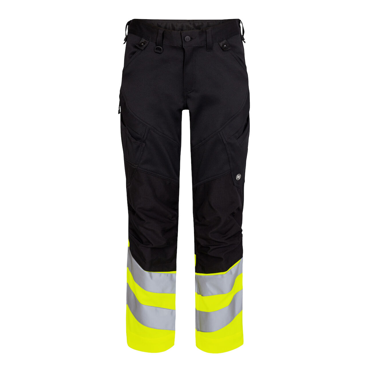 Elastiske og funksjonelle fluorescerende bukser med moderne snitt. Optimal passform med bl.a. ergonomisk formet kneparti. Det elastiske stoffet gjør at bevegelighet og komfort er på topp. Knapper for lett og rask montering av hengelommer. D-ring foran til feste av f.eks. ID-kort. To romslige skrålommer foran. To baklommer. To lårlommer som lukkes med glidelås. På venstre side har lårlommen en ekstra telefonlomme. På høyre side har lårlommen påmontert meterstokklomme med ekstra inndelinger og en knivlomme som begge har en forsterkning. Kneforsterkning/knelomme med borrelåslukking nederst og laget i ekstra slitsterkt CORDURA®-materiale. Reflekser rundt leggen. Buksene har en ekstra bred oppbrett som er beregnet for å kunne øke lengden på buksene hvis det er behov for ekstra benlengde. En enkelt søm sprettes opp, så får buksen ekstra benlengde – uten å måtte sys på nytt. Bekledningsklasse 1. Testet etter 50 ganger vask.