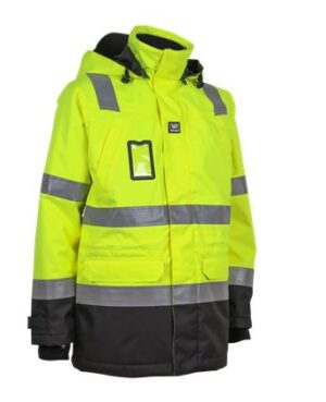 Vanntett ytterstoff, tapede sømmer og vattert for. Stående krage med fleece, avtakbar hette med brem, tilpasset hjelm, justering og borrelåslukking i front. Skjult toveis glidelås under frontklaff, ribb i avslutning på erme, Linning med hempe på innsiden for feste av seler, utvendig beltestropp og belte, glidelås under klaff i ben. Stropp på bryst og i nakken for feste av Regatta Freesafe redningsvest. 2 brystlommer med klaff, 1 ID-kortlomme, Mobillomme, 1 armlomme med klaff, 2 framlommer med glidelås under klaff, 1 kartlomme med glidelås, 1 innerlomme, 1 baklomme med klaff og 1 tommestokklomme. Refleks på skulder, erme og ben.