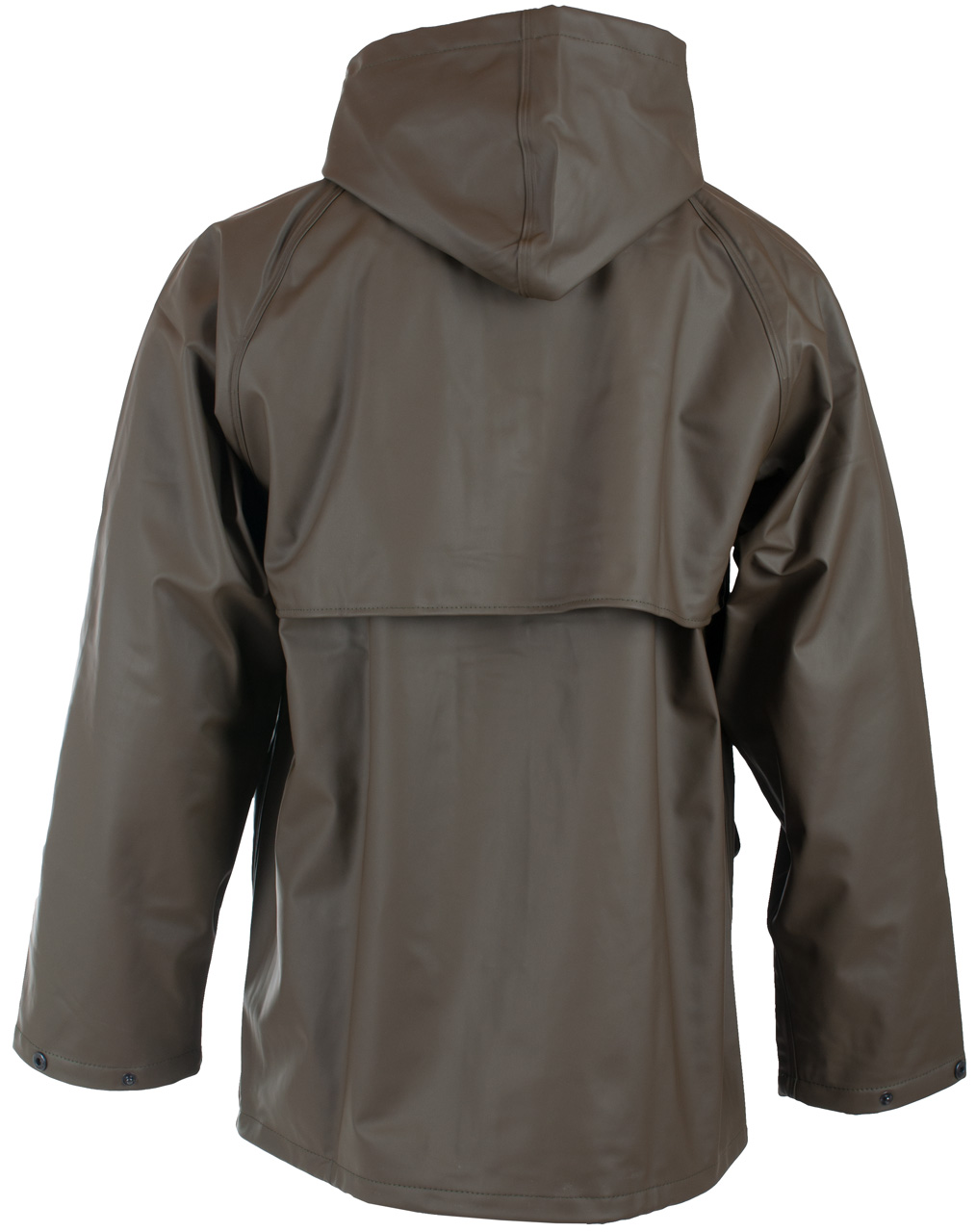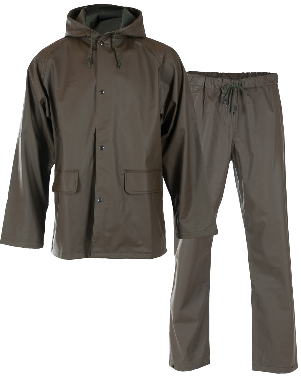Et meget godt regntøysett i kraftig PU med flosset bakside som leveres med jakke med hette og sidelommer, klaff på rygg for luftsirkulasjon og glidelås med klaff i front, bukse med snor og strikk i liv. Øko-Tex.