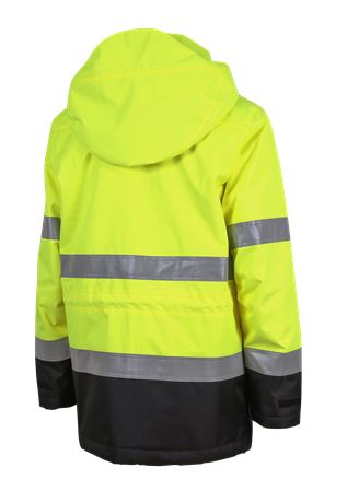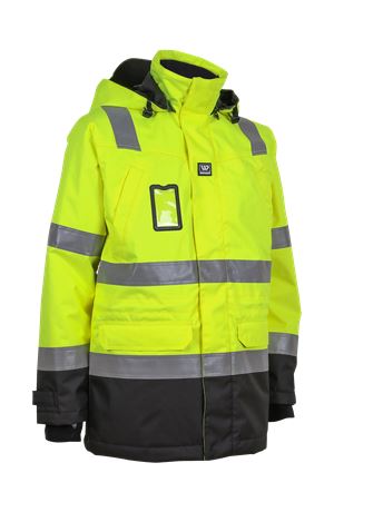 Ekstra refleks over skuldre. Skjult glidelås med Krage med fleece på innsiden, skjult avtakbar hette med stramming tilpasset hjelm, skjult glidelås under frontklaff. 2 brystlommer og 2 fremlommer med klaff. 1 ID-kortlomme, 1 kartlomme med glidelås og mobillomme på innsiden. Vanntett ytterstoff, vattert for, ribbestrikket mansjett med tommelgrep og borrelåsjustering i erme, justering av livvidde, og refleks på torso erme og skulder. Maks logoflate: 20×25 cm.